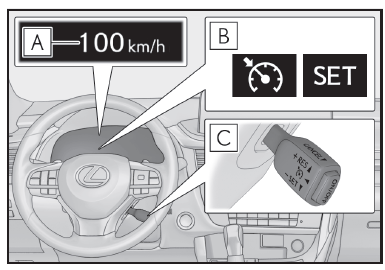 ■ Si "Panne régulateur de vitesse. Consultez votre concessionnaire." s'affiche sur l'écran multifonctionnel Appuyez sur le bouton "ON/OFF" une fois pour désactiver le système, puis appuyez à nouveau sur le bouton pour réactiver le système. S'il n'est pas possible de programmer la vitesse du régulateur de vitesse ou si le régulateur de vitesse se désactive immédiatement après avoir été activé, il est possible qu'un dysfonctionnement soit présent dans le régulateur de vitesse. Faites contrôler le véhicule par tout revendeur agréé Lexus ou tout réparateur agréé Lexus, ou tout autre réparateur de confiance.